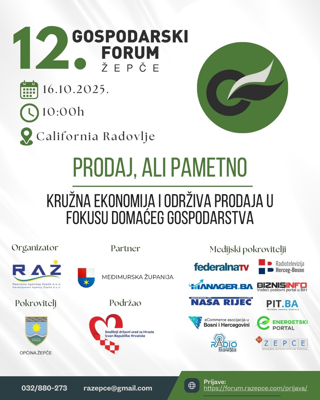 Razvojna agencija Žepče organizuje 12. Gospodarski forum općine Žepče pod nazivom: „Prodaj, ali pametno – Kružna ekonomija i održiva prodaja u fokusu domaćeg gospodarstva”, pod pokroviteljstvom općine Žepče i uz podršku Središnjeg državnog ureda za Hrvate izvan Republike Hrvatske. Forum, već više od desetljeća povezuje privrednike, institucije i stručnjake iz BiH i Europe.